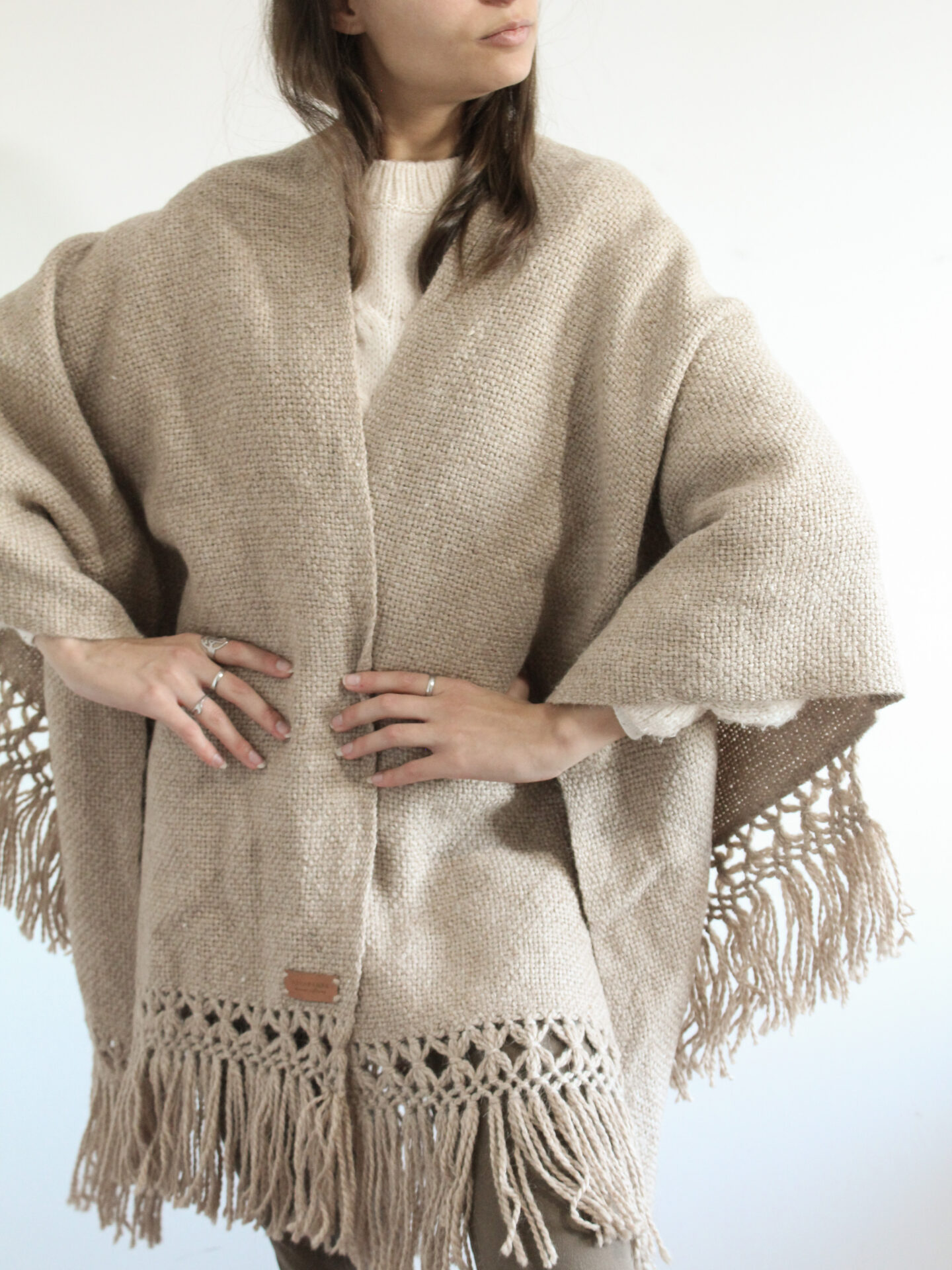 Ruana tejida a mano en telar por artesanos tejedores que viven en los Valles Calchaquíes y tejen desde sus casas en el monte. Hecha con lana pura de llama natural (sin tintes). Flecos hechos a mano.